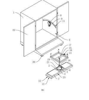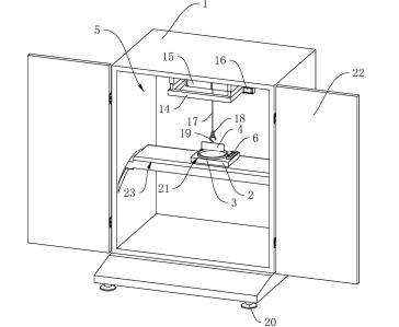 參照圖1,包括殼體1、工作臺2、盛液盒3和標(biāo)準(zhǔn)板4,殼體1內(nèi)設(shè)置有工作腔5,殼體1底部設(shè)置有多個支撐腳20,在本申請實施例中,支撐腳20設(shè)置為四個,四個支撐腳20設(shè)置于殼體1的四角位置;殼體1上鉸接有兩轉(zhuǎn)動門22;工作臺2設(shè)置于工作腔5內(nèi),工作臺2上開設(shè)有與盛液盒3適配的放置槽21,盛液盒3可放置于放置槽21中,標(biāo)準(zhǔn)板4設(shè)置于盛液盒3上方,標(biāo)準(zhǔn)板4通過升降結(jié)構(gòu)可升降連接于殼體1上,工作臺2上固定連接有水平儀6,在本申請實施例中水平儀6選用氣泡式水平儀,也可選擇其他體積較小的水平儀;工作臺2和殼體1之間設(shè)置有用于調(diào)平工作臺2的調(diào)平結(jié)構(gòu)。