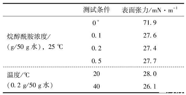 某學生自制烷醇酰胺不同測試下表面張力測試值,如表1所示。合成的烷醇酰胺具有較強的表面活性。25℃下純水表面張力為71.9℃mN/m。當50 g水中加入0.1 g烷醇酰胺時,其表面張力顯著降低,為27.6 mN/m。當增至0.2 g時達到最低值(27.4 mN/m),繼續增加,反而略有增加。上述結果表明,0.2 g烷醇酰胺加入量已達到其CMC濃度。同樣,在最佳濃度下(0.2 g/50 g水),隨著測試溫度的升高,烷醇酰胺水溶液表面張力降低。