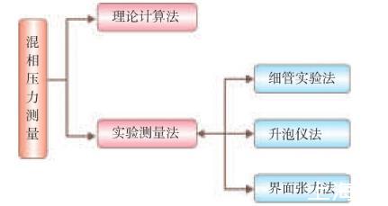 目前測(cè)量混相壓力的方法如圖3所示。國(guó)內(nèi)外許多專家研究了確定最小混相壓力的方法,包括理論計(jì)算和實(shí)驗(yàn)測(cè)定。但是,一般的理論計(jì)算精確度都不高,而實(shí)驗(yàn)測(cè)定方法具有較高的可靠性。實(shí)驗(yàn)測(cè)定方法包括細(xì)管實(shí)驗(yàn)、升泡儀法及界面張力法等。其中,界面張力法是通過直接測(cè)定注氣相與地層原油間的界面張力來確定最小混相壓力,既能觀測(cè)到形成混相的狀態(tài),而且操作時(shí)間也較短。細(xì)管實(shí)驗(yàn)法被認(rèn)為是最可靠的測(cè)量最小混相壓力方法,但細(xì)管實(shí)驗(yàn)也有局限性,不能模擬黏性指進(jìn)、重力超覆等因素,實(shí)驗(yàn)周期長(zhǎng),大約需要7~14天,且實(shí)驗(yàn)工作量大。升泡儀法是直接觀察混相過程,測(cè)量周期短,1h可以完成測(cè)量,測(cè)量結(jié)果受人為因素影響嚴(yán)重。而界面張力法是通過直接測(cè)定注氣相與地層原油間的界面張力來確定最小混相壓力,既能觀測(cè)到形成混相的狀態(tài),而且操作時(shí)間也較短,僅需5~6h。