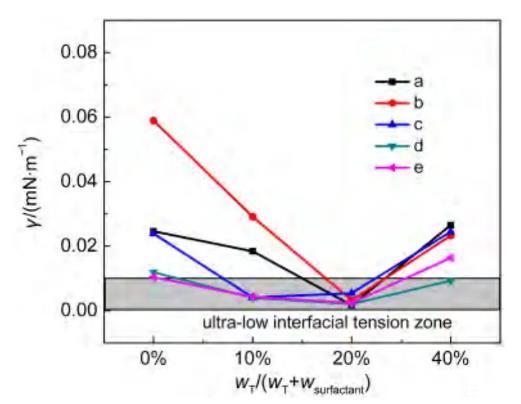 從圖3可見,在所考察的五個(gè)油水體系中,界面張力先隨保護(hù)劑T的比例增加而下降。當(dāng)保護(hù)劑加入量達(dá)到10%-20%(摩爾分?jǐn)?shù))時(shí),即達(dá)到最低界面張力。當(dāng)進(jìn)一步加入非離子保護(hù)劑時(shí),界面張力值反而有所上升。這是因?yàn)楫?dāng)較少的非離子保護(hù)劑加入時(shí),可有效控制陰陽(yáng)離子表面活性劑混合體系的沉淀,使混合體系的表面活性劑有效濃度增加。而當(dāng)保護(hù)劑T比例進(jìn)一步增加時(shí),陰陽(yáng)離子表面活性劑的實(shí)際總量相應(yīng)減少,使得界面上陰陽(yáng)離子表面活性劑的實(shí)際含量降低。上述實(shí)驗(yàn)結(jié)果充分說(shuō)明了保護(hù)劑的具體作用,即保護(hù)劑起到的作用是控制了實(shí)際體系中鈣鎂離子對(duì)陰陽(yáng)離子表面活性劑的不利影響,從而獲得了合理的油水兩相表面活性劑濃度的平衡,但是其本身并沒有對(duì)超低界面張力的獲得有實(shí)質(zhì)性貢獻(xiàn),是陰陽(yáng)離子表面活性劑在有效地降低實(shí)際油水界面張力。