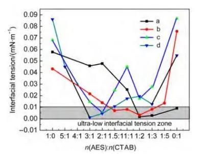 按照陰陽(yáng)離子表面活性劑:非離子保護(hù)劑摩爾比為4:1的比例,在總表面活性劑含量不變的情況下,變化AES/烷基季銨鹽CTAB的混合比例進(jìn)行研究。實(shí)驗(yàn)結(jié)果顯示,陰陽(yáng)離子表面活性劑復(fù)配體系的沉淀得到很好的控制,在七中、石西、陸九、莫北四個(gè)實(shí)際油水體系中獲得了較大范圍的超低界面張力區(qū)間(圖1)。從而證明了我們采用的三組分策略可有效幫助陰陽(yáng)離子表面活性劑復(fù)配體系實(shí)現(xiàn)超低界面張力。