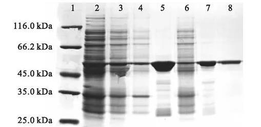 圖1失活型VhPLD的表達與純化SDS-PAGE電泳圖注:1.蛋白marker;2.菌體破碎液;3.菌體破碎后離心所得上清液;4.菌體破碎后離心所得沉淀;5.鎳柱純化所得100 mmol/L咪唑洗脫峰樣品;6.鎳柱純化的上樣穿過峰樣品;7.G-25柱純化的洗脫峰樣品;8.Q柱純化的300 mmol/L氯化鈉梯度洗脫峰樣品。