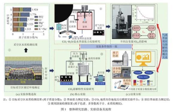 首先,通過原位界面張力測定儀開展的實驗揭示了不同溫壓條件下CO2與地層水系統間的界面張力(IFT)變化規律。研究發現,儲層壓力的增加會導致IFT顯著降低,而溫度升高時,IFT會略有上升。此外,礦化度的增加會導致IFT增高,特別是在高溫、高礦化度的環境中。不同的陽離子溶液類型對CO2與鹽溶液之間的IFT也有顯著影響,表現出隨陽離子價態的升高而增大的趨勢。