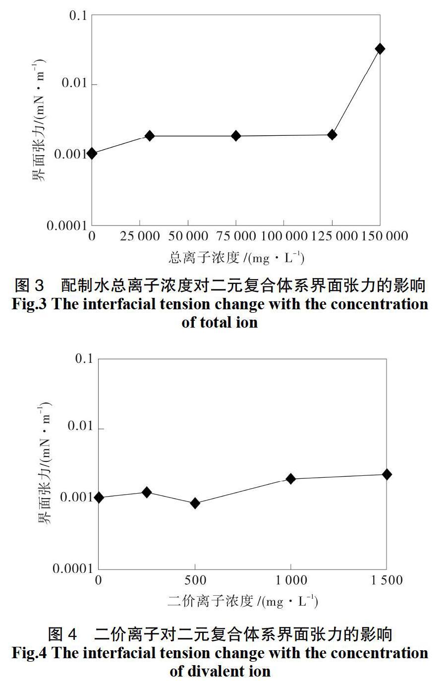但界面張力隨著礦化度及二價離子濃度的增加依舊發(fā)生小范圍的波動,這種影響的主演要原因是由于水中陽離子增大了表面活性劑分子向油水界面擴(kuò)散的速率并且陽離子可以進(jìn)入雙電層使界面層中活性劑分子排列更緊密。另一方面,金屬陽離子對二元體系聚合物分子發(fā)生蜷曲,間接影響二元體系界面張力。