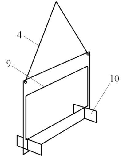 拉力框的設計是本次測試能否成功的關鍵之一,其結構如圖3,與通用的拉力框有很大不同。其形狀如漢字中“口”字的形狀,由厚0.25mm薄鋁片制成。上部底緣稱之為刀口(9),長l=50mm,刀口與液面接觸后拉起液膜(2)。拉力框兩側各寬3mm,其作用是保持拉起的液膜的穩定,使之不會過早斷裂。拉力框底部設有張開的與框面垂直的翼片(10),可防止拉力框擺動。拉力框通過輕軟細線懸掛于力敏傳感器(5)上,通過拉動懸線(4),可調整拉力框與液面的平行度。