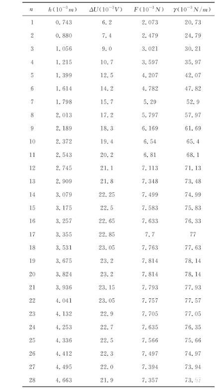 將拉力框置于待測液體中,調節好刀口與液面的平行度。讓液面緩慢上升至與刀口接觸。然后下降液面,形成并拉伸液膜至液膜斷裂。記錄此過程中液面在不同高度(即液膜不同拉伸長度)時的位置及此時力敏傳感器的讀數U,根據f=kU,(力敏傳感器的轉換系數k=340.2×10-6N/mV),可計算出不同高度的受力大小fn。