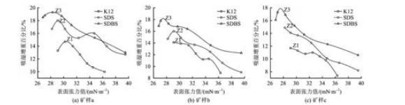 注:吸濕增重百分比為增重量除以樣品重,Z1,Z2,Z3代表增重百分比最大圖2吸濕增重百分比與表面張力versus surface tension
