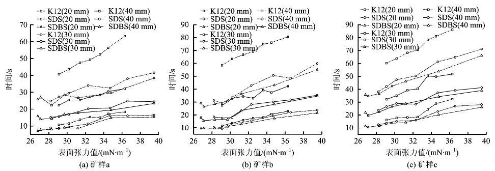 通過測定液面滲透到20,30,40 mm的時間,繪制3種礦塵反滲時間與表面張力的關系,如圖3所示。