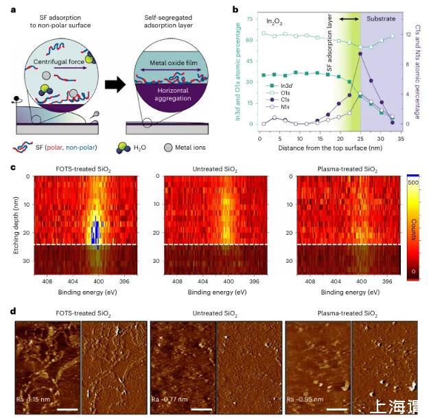 圖3絲綢表面活性劑在薄膜-固體界面的自適應(yīng)吸附。a,表面活性劑在涂覆過程中的自分離示意圖。b,XPS深度剖面化學(xué)成分分析厚度為25納米的In2 O3薄膜的化學(xué)成分分析。數(shù)據(jù)c,N1s在In2O3薄膜中的N1s分布。SF沉積在具有不同自由表面能的基底上的In2 O3薄膜中的N1s分布。白色虛線線表示與二氧化硅d,通過選擇性蝕刻金屬氧化物獲得的埋藏SF層的高度和偏轉(zhuǎn)AFM圖,通過選擇性蝕刻金屬氧化物獲得(比例尺,1μm;Ra,平均值;Ra,算術(shù)平均粗糙度)。