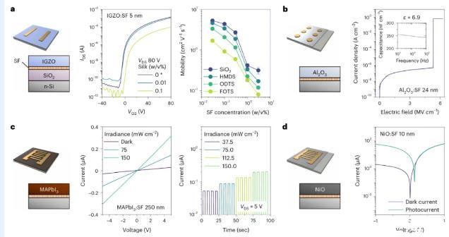圖4使用絲表面活性劑的水激活納米器件?;贗GZO:SF的場效應(yīng)晶體管(FET)。中間:用不同的晶體管的轉(zhuǎn)移曲線。右圖:不同SF晶體管的電荷遷移率。數(shù)據(jù)點和誤差條顯示平均值±s.d.(樣本數(shù)為3)。以及制備的MAPbI3的薄膜的I-V特性。d,基于NiO:SF的光電探測器的結(jié)構(gòu)(左)和在不同側(cè)向電壓(中)和時間(右)下的光探測器的結(jié)構(gòu)(左)及其在白光照明下的I-V特性(右)。(右圖)。所有器件都是在疏水性基底上制造的SF基絕緣體的結(jié)構(gòu)(左)及其電流密度-電場曲線。