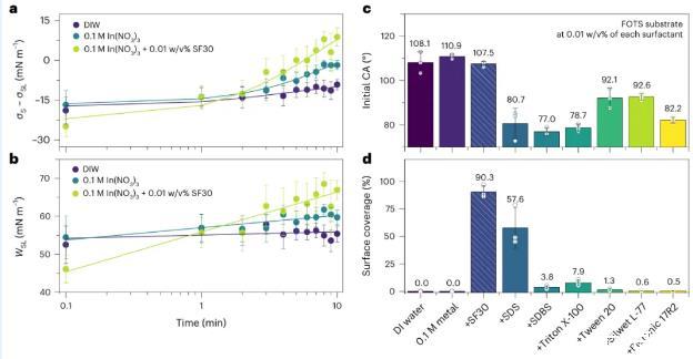 圖2利用絲表面活性劑進行高效的界面能控制。水溶液中SF在水溶液中的界面張力(a)和粘附功(b)的隨時間變化。(d)與其他商用和最先進表面活性劑的比較。表面活性劑。在a和b中,數(shù)據(jù)點和誤差條表示平均值±標準偏差(s.d.標準偏差(s.d.)(樣本量為4),直線表示線性回歸。在c和d中,點表示數(shù)據(jù)點。色條和誤差條顯示平均值±標準差(樣本量3)