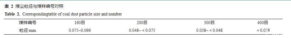 將EMI原液稀釋至質(zhì)量分?jǐn)?shù)分別為0.1%、0.2%、0.4%、0.6%、0.8%、1.0%、2.0%、4.0%、6.0%、8.0%的混合溶液。實(shí)驗(yàn)煤樣選取黃陵一號(hào)煤礦弱黏煤樣,煤樣工業(yè)分析結(jié)果見表1。在制備煤塵樣品時(shí),根據(jù)有關(guān)文獻(xiàn)對(duì)黃陵一號(hào)煤礦綜采工作面煤塵粒徑分布進(jìn)行檢測(cè),并結(jié)合國際標(biāo)準(zhǔn)化組織對(duì)粉塵粒徑的定義,以及實(shí)驗(yàn)室制備條件,去除煤塊外表皮,使用破碎機(jī)對(duì)煤心破碎60 s,用160、200、300、400目標(biāo)準(zhǔn)工業(yè)篩對(duì)煤粉進(jìn)行篩分,共篩分出0.075~0.096、0.048~<0.075、0.038~<0.048、<0.038 mm共4個(gè)粒度范圍的樣品進(jìn)行實(shí)驗(yàn),其中煤塵粒徑與煤樣編號(hào)見表2。煤樣制備完成后,將其放入80℃的真空干燥箱,真空干燥8 h后密封保存以備實(shí)驗(yàn)使用。