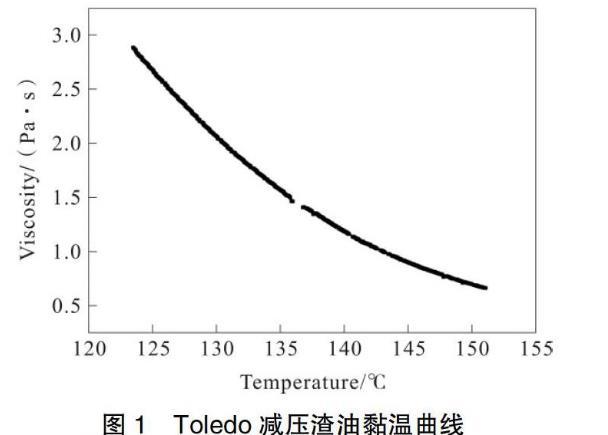 考慮到上述因素,本文在根據現有儀器測得的相對較低溫度條件下的黏溫曲線關系的基礎上進行了減壓渣油較高溫度條件下黏溫關系的計算近似,以求對減壓渣油反應模型進行較為準確的理論模型建立的指導。就目前的技術而言,在缺少直接測量儀器以及相關行業標準的情況下,利用模型進行計算模擬近似,是最具說服性地技術手段。圖1為實驗室中實際測得的在相對較低溫度下Toledo減渣的黏溫曲線。