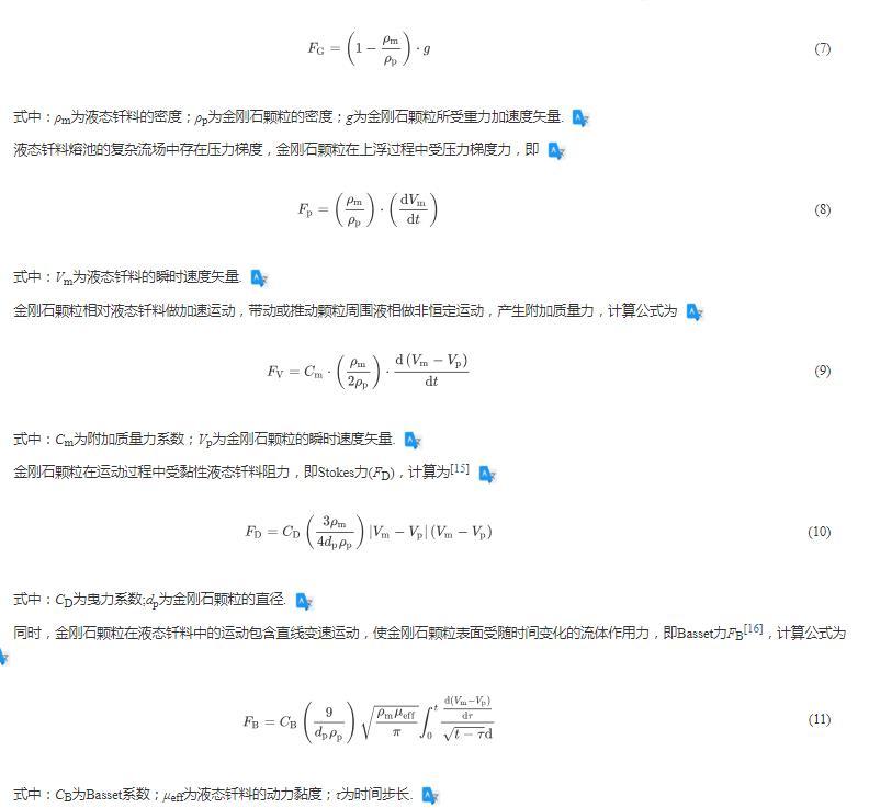 同時,金剛石顆粒在液態(tài)釬料中的運(yùn)動包含直線變速運(yùn)動,使金剛石顆粒表面受隨時間變化的流體作用力,即Basset力FB,計算公式為
