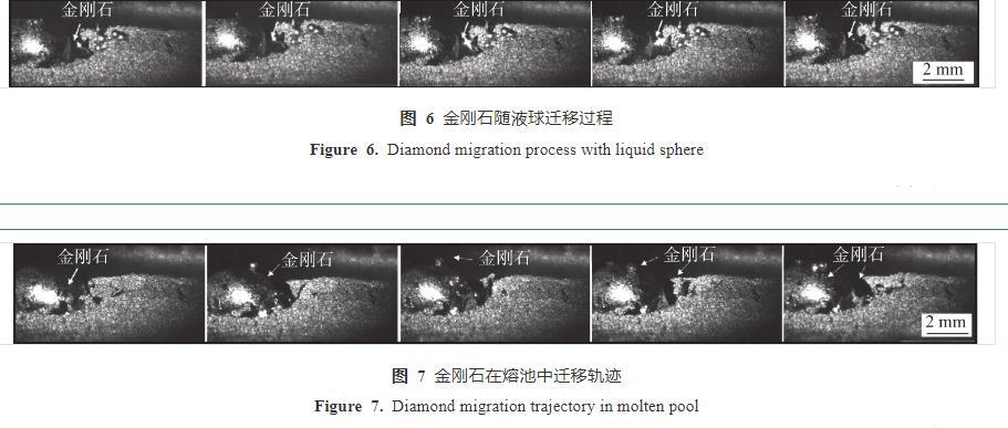 圖8為金剛石置于釬料底部時,金剛石在激光釬涂過程中運(yùn)動軌跡。可見,無論金剛石是直接鋪置于釬料表面,還是置于釬料底部,在釬涂過程中,金剛石均會上浮到涂層表層。具體過程為在激光熱源作用下,表層的釬料開始熔化成液態(tài)小球,由于金剛石的高透光性和高熔點(diǎn),金剛石不會熔化。在液態(tài)小球聚集長大的過程中,金剛石沿著液球邊緣運(yùn)動,當(dāng)液態(tài)小球匯入大熔球時,金剛石繼續(xù)沿著大熔球的邊緣向表面運(yùn)動,最后凝固于釬料涂層表層。