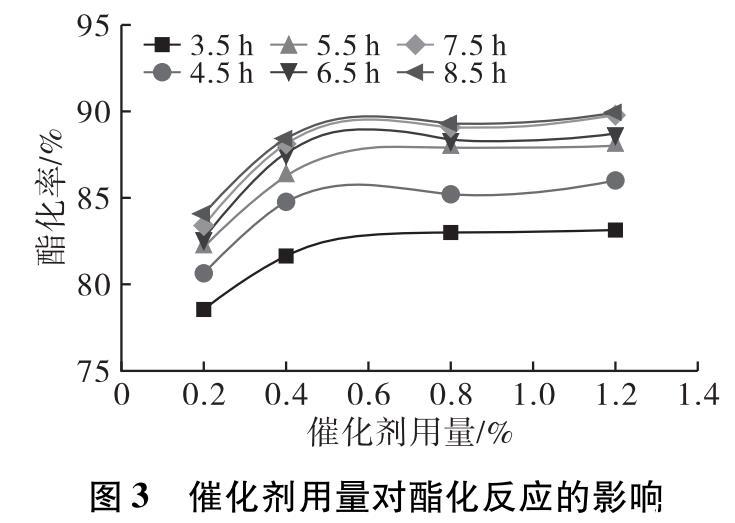 在投料比1∶1,預(yù)熱溫度80℃,預(yù)熱時(shí)間5 min,催化劑選擇4?型分子篩,反應(yīng)溫度140℃,反應(yīng)時(shí)間8.5 h,催化劑用量分別為0.2%、0.4%、0.8%、1.2%條件下進(jìn)行酯化反應(yīng)。反應(yīng)3.5 h后每隔1 h取樣測(cè)試產(chǎn)物酸價(jià),計(jì)算酯化率隨時(shí)間的變化,結(jié)果如圖3所示。