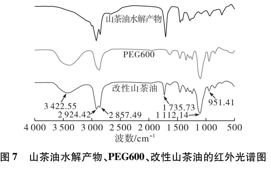 用50 mL的乙酸乙酯飽和食鹽水溶液分3次萃取產(chǎn)物,除去未完全反應(yīng)的PEG600和山茶油水解產(chǎn)物,氮吹,干燥。對(duì)山茶油水解產(chǎn)物、PEG600和改性山茶油分別進(jìn)行紅外性能表征,其紅外光譜圖如圖7所示。