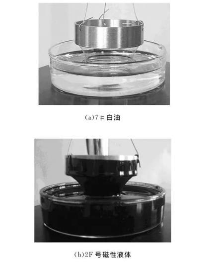 力敏傳感器定標(biāo)數(shù)據(jù)見(jiàn)表1,使用Origin軟件對(duì)直線(xiàn)進(jìn)行擬合,可得力敏傳感器靈敏度B=7.727V/N.測(cè)量無(wú)外加磁場(chǎng)作用的磁性液體表面張力系數(shù)時(shí),為直觀(guān)觀(guān)察拉脫時(shí)液膜的變化過(guò)程,將培養(yǎng)皿放置于電磁線(xiàn)圈端部進(jìn)行測(cè)量,圖3為拉脫過(guò)程中某一瞬間液膜的收縮狀態(tài),從圖中可看到,磁性液體的液膜拉得更長(zhǎng),液膜收縮的趨勢(shì)比白油更明顯,這主要是因?yàn)榇判砸后w中加入的表面活性劑降低了其表面張力。可從表面張力形成原理來(lái)分析其中的原因:第一,液體表面張力系數(shù)的大小宏觀(guān)上反映出液體表面具有自動(dòng)收縮的趨勢(shì),表面張力系數(shù)較大的白油由于分子和分子之間的引力較大,表面層分子更容易向液體內(nèi)部運(yùn)動(dòng),某一拉力作用下,液膜斷裂,不易拉起較長(zhǎng)的液膜;第二,不同液體對(duì)同一種固體的浸潤(rùn)程度不一樣,表面張力系數(shù)小的液體(0.03N/m左右),幾乎能浸潤(rùn)一切固體;表面張力系數(shù)較大的液體,只能浸潤(rùn)某些固體;7#白油的表面張力系數(shù)大于磁性液體,片狀吊環(huán)和磁性液體的結(jié)合力大于片狀吊環(huán)和7#白油的結(jié)合力;液膜不容易和片狀吊環(huán)脫離,拉起來(lái)的液膜比較長(zhǎng)。