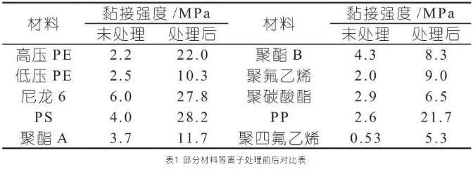 表1部分材料等離子處理前后對比表