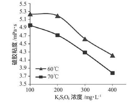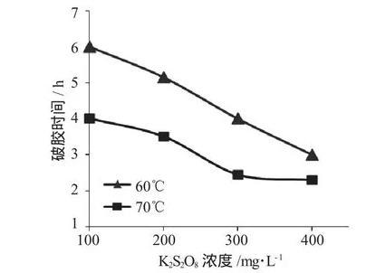 室內實驗溫度為60℃與70℃的對比,70℃時K2S2O8半衰期為495min比60℃的半衰期2310min分解速度更快,破膠時間更短,適用于現場壓裂作業。吳錦平得到結論50℃以下,過硫化物破膠能力減弱,不再適合做水基壓裂液的破膠劑。