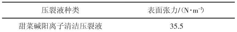 由表3可知,甜菜堿陽離子清潔壓裂液的破膠液的表面張力比水的表面張力明顯要低,為35.5 N/m。壓裂液易于返排,對油氣層的損害低。