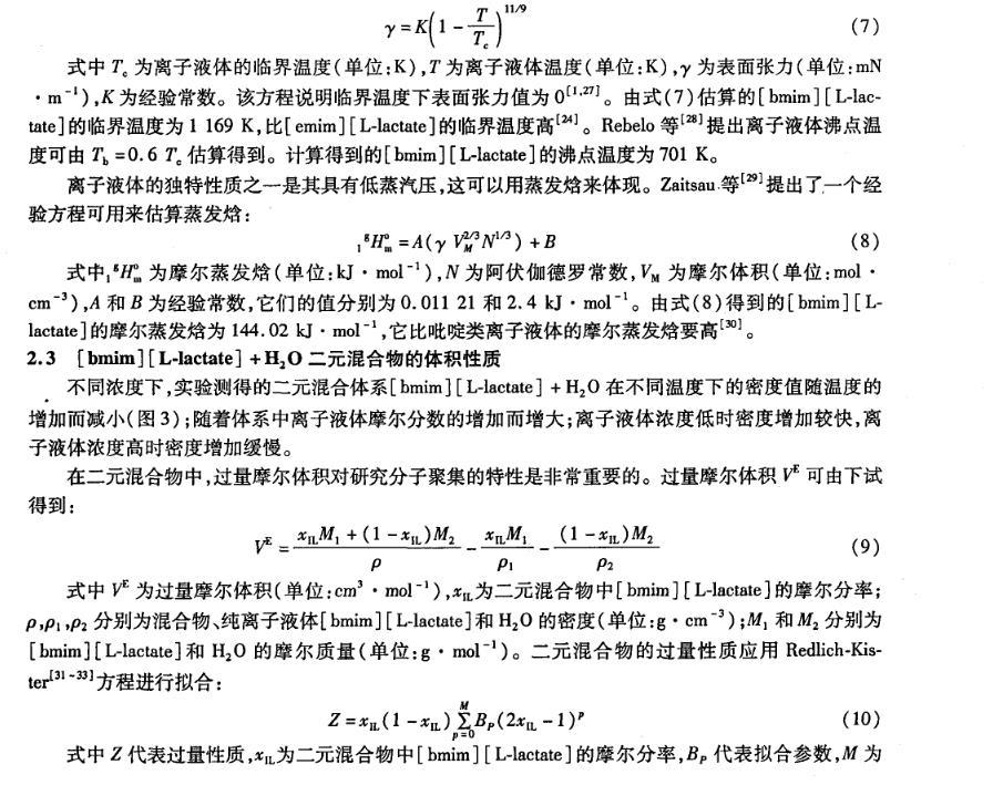 式中Tc為離子液體的臨界溫度(單位:K),T為離子液體溫度(單位:K),γ為表面張力(單位:mN·m-1),K為經驗常數。該方程說明臨界溫度下表面張力值為0。由式(7)估算的[bmim][L-lactate]的臨界溫度為1 169 K,比[emim][L-lactate]的臨界溫度高。Rebelo等提出離子液體沸點溫度可由Tb=0.6 Tc估算得到。計算得到的[bmim][L-lactate]的沸點溫度為701 K。
