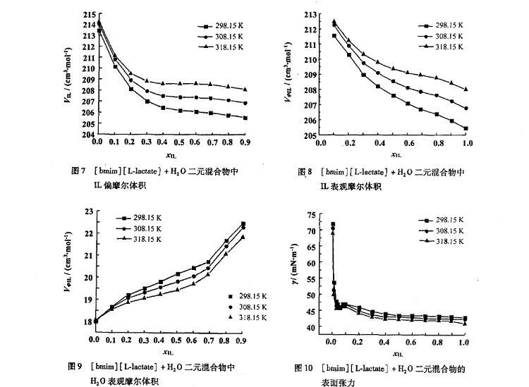 圖7[bmim][L-lactate]+H2O二元混合物中IL偏摩爾體積
