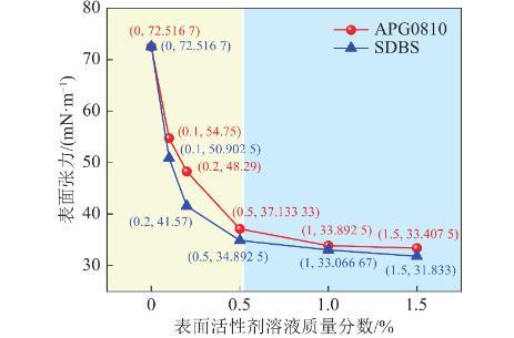 相同質(zhì)量分數(shù)下,SDBS溶液表面張力普遍比APG0810溶液低。在表面活性劑溶液質(zhì)量分數(shù)為0.01%、0.02%、0.05%時,SDBS分別較APG0810溶液低7.03%、13.92%、6.03%。這是由于APG0810為非離子表面活性劑,在水中不電離出離子,SDBS為陰離子表面活性劑,在水中電離出陰離子,同種電荷間斥力在宏觀上表現(xiàn)出表面張力低的現(xiàn)象。