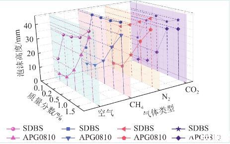 對比同一種溶液通入不同氣體的高度進行分析,空氣、氮氣及二氧化碳注入液體發(fā)泡性規(guī)律基本一致,均在質(zhì)量分數(shù)最高時發(fā)泡率達到最大。通入甲烷時則在SDBS溶液質(zhì)量分數(shù)為0.02%時就達到了與0.15%接近的發(fā)泡高度。APG0810在甲烷注入時也比其他氣體總體發(fā)泡率高,這是由于甲烷的摩爾質(zhì)量最低,氣體密度低,分子擴散快,泡沫膨脹速率變快導致的。