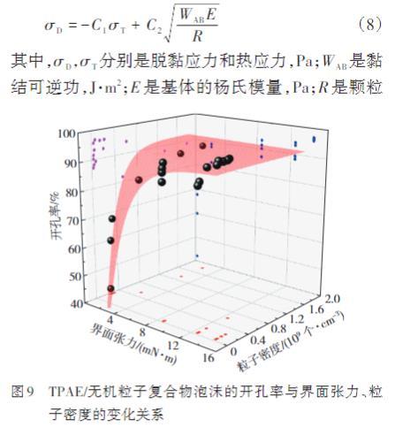 無機粒子與TPAE具有較高界面張力,并且粒子在TPAE基體中的分布密度較大時,復合物傾向于形成具有更高開孔率的泡沫。其中對于TPAE/CaSiO3復合物,CaSiO3的團聚現(xiàn)象導致的粒子尺寸增加也對泡沫的開孔率產生改善效果。此現(xiàn)象的理論依據(jù)可追溯至Vollenberg和Heikkinen提出的關于脫黏所需起始應力的公式(8)