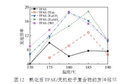 圖12展示了4種TPAE/無機粒子泡沫熟化后的發(fā)泡倍率隨溫度變化的情況。結果表明,相較于純TPAE,4種復合物泡沫的最終發(fā)泡倍率均有所增加,其中TPAE/CaCO3、TPAE/CaSiO3及TPAE/WI顯著提升。已知影響發(fā)泡倍率的主要因素有發(fā)泡劑的溶解度和聚合物的流變性能。由于無機粒子的添加量較少,基本不會影響CO2在復合物中的溶解度及流變性能。因此TPAE/無機粒子復合物的初始發(fā)泡倍率與純TPAE基本一致,但無機粒子的添加會促進TPAE形成開孔結構,尤其是CaCO3、CaSiO3以及WI可使TPAE形成高開孔率的泡沫,減小了泡沫的收縮,使得完全熟化后的發(fā)泡倍率遠高于TPAE,大大提高了TPAE的發(fā)泡性能。