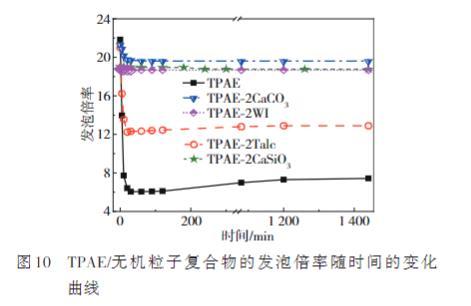 圖10 TPAE/無機粒子復合物的發(fā)泡倍率隨時間的變化曲線