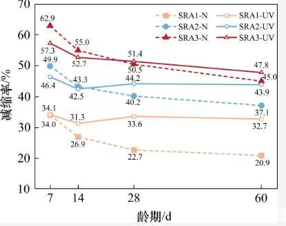 從圖3中可以觀察到,隨著齡期的延長,干縮曲線SRA2-UV逐漸接近于干縮曲線SRA3-UV,而SRA3-UV的干縮值沒有進一步降低。這表明上述分析是合理的。在強紫外線輻射下,當減縮劑的摻量超過3%時,其孔隙溶液中的SRA濃度超過臨界濃度(CMC),進一步增大摻量不能增強SRA在該應用環境中的減縮效果。