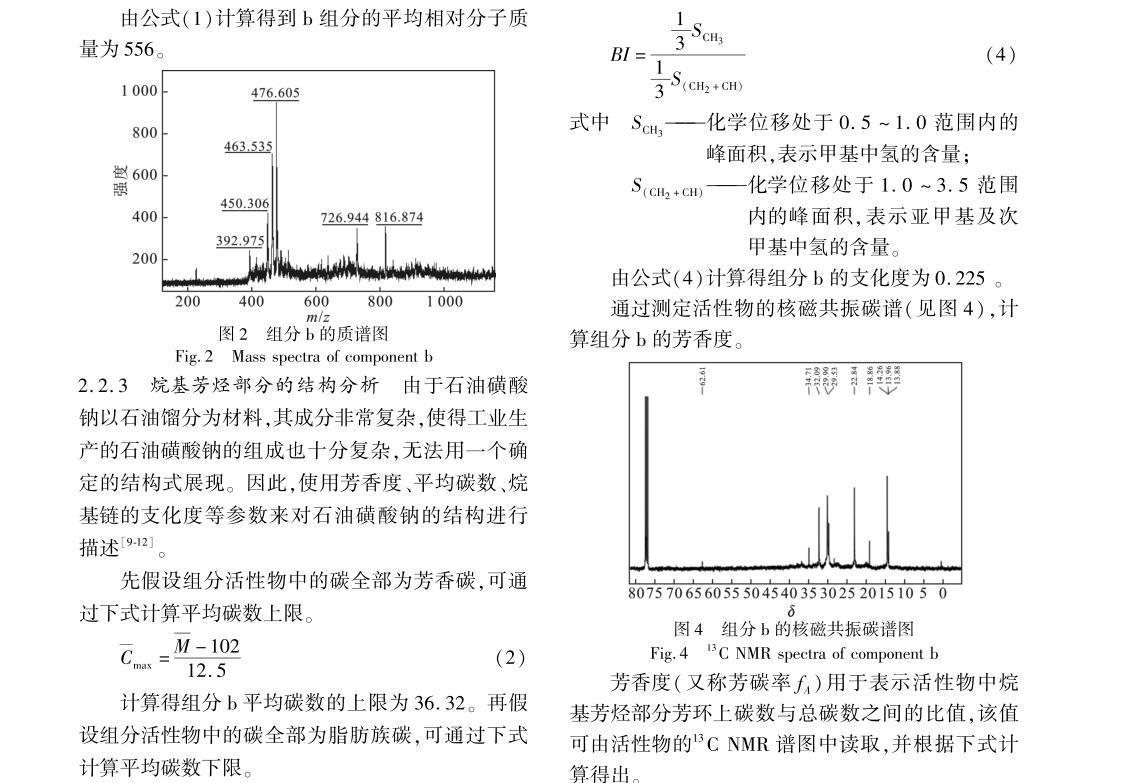 綜上所述,組分b的相對分子質(zhì)量為556,平均每個分子中含有1~2個苯環(huán),平均每個烷基側(cè)鏈含有25~29個碳原子,且平均每個烷基鏈含有4個支鏈。