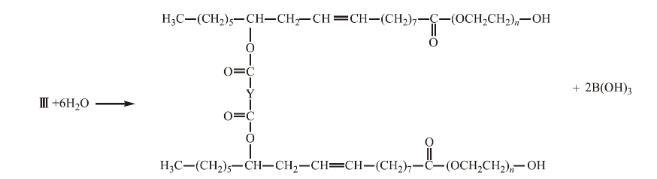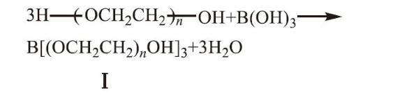 將0.12 mol聚乙二醇和0.04 mol硼酸依次裝入帶有攪拌器、分水器、回流冷凝器的三口燒瓶中,并連接減壓裝置。加熱至120℃,在負(fù)壓下進(jìn)行反應(yīng)至出水量不變,酯化過(guò)程如下所示: