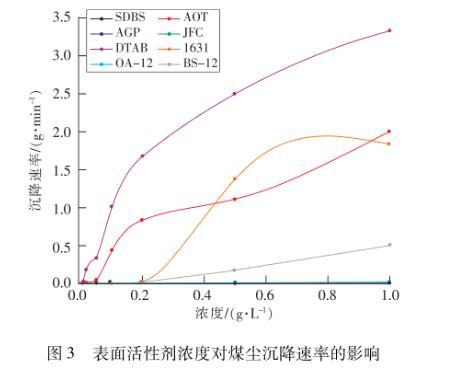 從表4和圖3可以看到,在0.000 1~1 g/L的濃度范圍內(nèi),煤塵的沉降時(shí)間隨表面活性劑濃度的增大而減小,沉降速率則隨濃度的增大而增大。當(dāng)濃度小于0.005 g/L時(shí),煤塵在8種表面活性劑溶液中的沉降時(shí)間均大于1 h,沉降速率接近于0,在溶液表面會(huì)形成一層黑色的“膜”,煤塵無(wú)法沉降。隨著表面活性劑溶液濃度增大,煤塵的沉降時(shí)間將會(huì)縮短,速率會(huì)增大,當(dāng)濃度超過(guò)臨界膠束濃度后,溶液表面張力隨濃度增加不再改變,但沉降時(shí)間會(huì)繼續(xù)縮短,沉降速率會(huì)繼續(xù)增大,這可能是由于煙煤的煤塵具有較大的比表面積和孔隙率,表面活性劑濃度的增大,更多的表面活性劑分子有機(jī)會(huì)吸附于煤塵上,加快了煤塵沉降。陰離子和非離子表面活性劑的溶液濃度對(duì)潤(rùn)濕煤塵作用的影響較大,當(dāng)表面活性劑濃度從0.1 g/L增大到0.2 g/L時(shí),煤塵在SDBS和JFC中的沉降時(shí)間分別從58.17 min和22.75 min迅速降至7.3 min和4.73 min;當(dāng)表面活性劑濃度從0.005 g/L增大到0.05 g/L時(shí),煤塵在AOT和APG的沉降速率分別從0002 2 g/min和0.002 5 g/min迅速增至005 g/min和0.33 g/min。而在0.000 1~1.0 g/L的實(shí)驗(yàn)濃度區(qū)間內(nèi),濃度對(duì)陽(yáng)離子和兩性型表面活性劑潤(rùn)濕煤塵作用的影響都較小,潤(rùn)濕煤塵效果較差。SDBS,AOT,APG和JFC4種表面活性劑濃度分別達(dá)到0.5,0.1,0.02和0.5 g/L時(shí),煤塵在溶液中的沉降時(shí)間小于1 min,速率大于1.0 g/min,煤塵效果好。