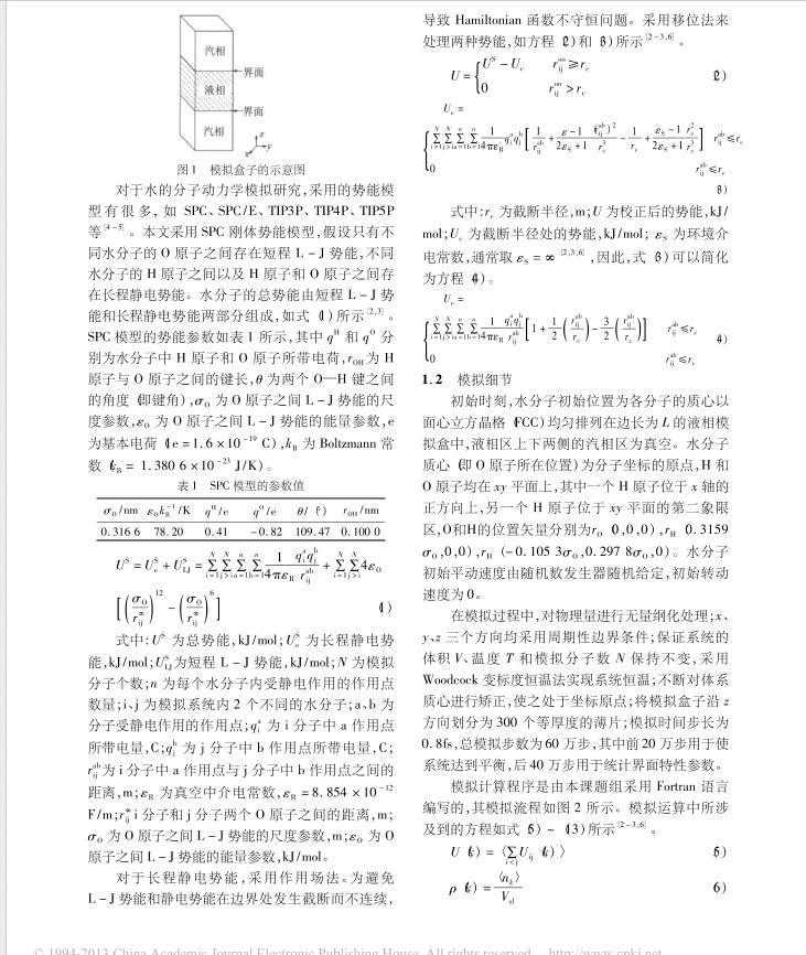 水是許多化學反應過程廉價的反應溶劑,也是化工生產過程常用的工質。汽液界面行為是研究水相變傳熱問題的基礎。目前,工程上許多有關水蒸發、水蒸氣冷凝、加熱干燥等相變傳熱數據仍主要依賴于實驗。隨著分子模擬技術的發展,采用分子動力學模擬方法,從分子水平揭示水汽液界面特性的研究,引起了國內外許多學者的極大關注。本文擬采用SPC模型,對水汽液界面特性進行平衡分子動力學模擬研究,探討溫度、截斷半徑、模擬分子數對水汽液界面特性的影響規律。