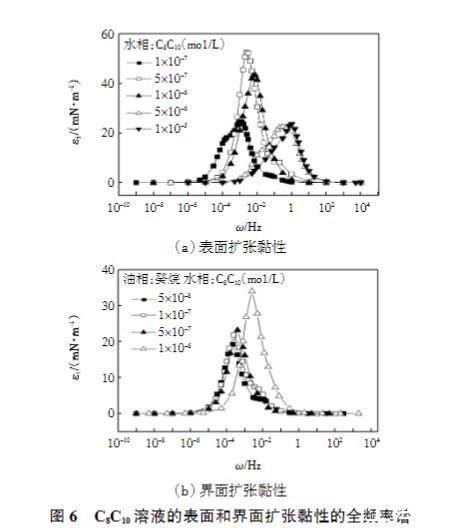 圖6 C8C10溶液的表面和界面擴張黏性的全頻率譜