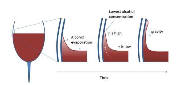 隨著彎月面開始在玻璃杯的壁面形成一層膜,其中的酒精進一步揮發,造成了更大的表面張力梯度。更多的葡萄酒被拉到玻璃杯壁上,直到形成液滴。此時重力將起作用,酒淚沿玻璃杯壁流回葡萄酒的主體內。