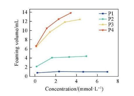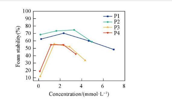 圖6示出4種表面活性劑泡沫穩定性隨濃度的變化情況。泡沫穩定性隨著濃度的增加先升高至最大值后又降低。這是因為表面活性劑的吸附導致了Gibbs-Marangoni效應。當液膜受到沖擊局部變薄時,產生表面張力梯度,導致鄰近區域吸附的表面活性劑攜帶水化層向薄膜處遷移,以恢復原來的表面張力并修復液膜。在較低濃度時,表面活性劑濃度的增加使得Gibbs-Marangoni效應隨之加強,進而有效阻止液膜變薄,增加泡沫的穩定性。當濃度大于cmc后,溶液中的表面活性劑分子能夠快速吸附在界面處,使得Gibbs-Marangoni效應減弱,泡沫穩定性降低。在4種表面活性劑中,P2的泡沫穩定性最強,這可能是由于分子在空氣/水界面上排列最緊密,形成的液膜強度更大,因此泡沫不易發生破裂。
