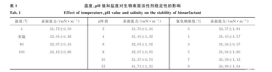 表1溫度、pH值和鹽度對生物表面活性劑穩定性的影響