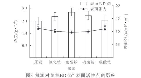 氮源在微生物生長和酶的合成中起著重要作用。由圖3可得,氮源種類對菌株BD-2產表面活性劑的影響存在顯著差異,以硝酸銨、硝酸鈉和氯化銨為氮源時,菌株BD-2產表面活性劑的量顯著高于尿素和硫酸銨(P<0.05),其產表面活性劑量大小依次為硝酸銨>硝酸鈉>氯化銨>硫酸銨>尿素;以硝酸銨、硝酸鈉和氯化銨為氮源時,菌株BD-2能顯著降低發酵液表面張力(P<0.05),表面張力大小依次為尿素>硫酸銨>氯化銨>硝酸鈉>硝酸銨。以硝酸銨為氮源時,表面活性劑量最高,為2.40 g/L,而表面張力最低,為29 mN/m。研究結果表明,硝酸銨有利于菌株BD-2產表面活性劑,而硝酸鈉和氯化銨效果不明顯,因此,選擇硝酸銨為菌株BD-2的最適氮源。