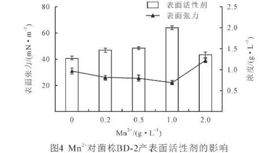 不同Mn2+、Fe2+濃度對菌株BD-2產表面活性劑的影響不同。由圖4可見,隨著Mn2+濃度的增加,表面活性劑量呈現先升高后降低的趨勢,而表面張力先下降后升高。Mn2+濃度0.5~1 g/L,表面活性劑量明顯升高,在1 g/L時,表面活性劑量最大,為2 g/L,而表面張力從30.9 mN/m下降到26.2 mN/m。在1%以后,表面活性劑量顯著下降(P<0.05),由2g/L下降到1.36 g/L,而表面張力顯著上升(P<0.05),由26.2 mN/m上升到39.2 mN/m。結果研究表明,菌株BD-2在Mn2+濃度為1 g/L的表面活性劑量最多,表面張力最小。因此,菌株BD-2的最適Mn2+濃度為1%。