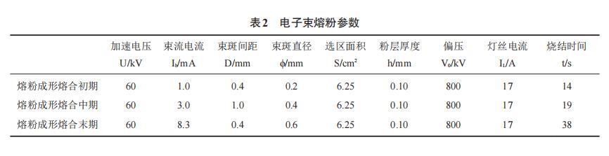 (1)試驗(yàn)結(jié)果吻合熔粉理論模型,在熔合初期電子束預(yù)熱工藝下,離散的粉末微小粒徑的顆粒幾乎完全熔入大顆粒當(dāng)中,且顆粒與顆粒之間呈凝聚態(tài)結(jié)構(gòu)。