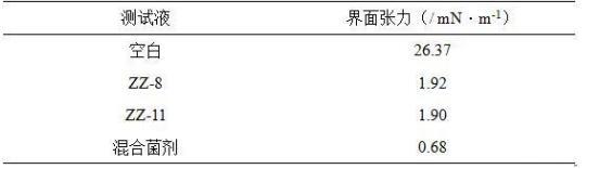 表面張力是洗油劑對原油洗脫能力的重要指標,數值越低、洗脫能力越強。測試結果顯示解淀粉芽孢桿菌(Bacillus amyloliquefaciens)ZZ-11和膠凍樣芽孢桿菌(Bacillus mucilaginosus)ZZ-8發酵上清液均能降低表面張力,混合菌劑發酵上清液的表面張力值更低。