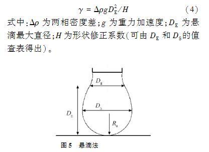 Jyoti等使用軸對(duì)稱液滴形狀分析法(axisymmetricdropshapeanalysis,ADSA)研究單層壓縮速率對(duì)表面張力?表面積等溫線形狀的影響。懸滴法(見圖5)可認(rèn)為是ADSA的雛形,其通過Laplace方程應(yīng)用于液滴輪廓來確定懸垂液滴的表面張力和接觸角,懸滴法實(shí)質(zhì)上是滴外形法的一種。滴外形法的基本原理是:當(dāng)液滴在管口形成時(shí),液滴形狀與表面張力存在一定的關(guān)系。懸滴法測(cè)量表面張力可由下列公式計(jì)算:γ=ΔρgD2E/H(4)式中:Δρ為兩相密度差;g為重力加速度;DE為懸滴最大直徑;H為形狀修正系數(shù)(可由DE和DS的值查表得出)。