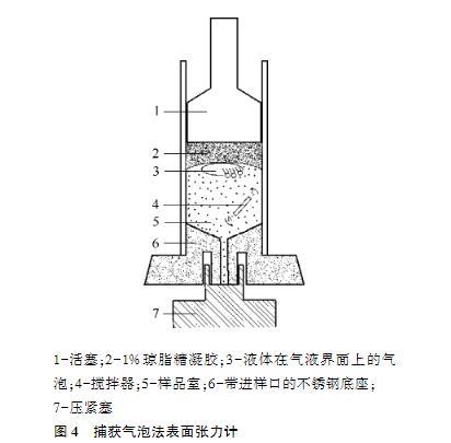 為了避免膜泄漏的出現(xiàn),Schürch等引入了一種防泄漏的捕獲氣泡法表面張力計(jì)。在捕獲氣泡法裝置中(見圖4),待測(cè)液體充滿樣品室,樣品室頂部鍍有一親水性瓊脂糖凝膠,從底部進(jìn)樣口引入的氣泡在浮力作用下上升并緊靠瓊脂糖凝膠層,同時(shí)氣泡和凝膠層之間由于液體樣品薄層的阻隔,故不會(huì)黏附于凝膠層之上。氣泡的體積通過改變樣品室中的壓力來控制。隨著氣泡體積減小,表面積減小,氣泡表面張力下降。氣泡形狀隨表面張力的變化而變化,從球形到橢圓形。對(duì)于初始直徑大于5mm氣泡,當(dāng)表面張力趨于0時(shí),氣泡呈薄圓盤狀。測(cè)量時(shí),通過推動(dòng)活塞改變樣品室的壓力來控制氣泡體積,并用視頻記錄氣泡體積變化。最后從視頻圖像中測(cè)得氣泡的高度和直徑,利用Malcolm等提出的方法計(jì)算氣液界面的表面張力、氣泡體積和表面積。