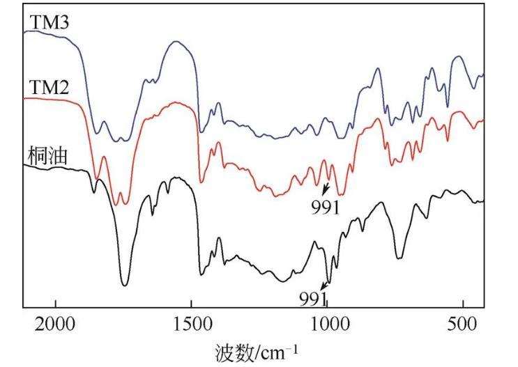 桐油中的共軛不飽和鍵與馬來酸酐易發(fā)生Diels-Alder(D-A)反應(yīng),生成桐油酸酐,反應(yīng)條件對(duì)產(chǎn)物的分布具有重要影響。由于桐油為混合物,每分子中有3條不飽和鏈,控制MA的加入量及反應(yīng)條件,可以控制桐油二酸酐(TM2)和桐油三酸酐(TM3)的形成。文獻(xiàn)報(bào)道大多數(shù)桐油和馬來酸酐反應(yīng)以有機(jī)錫為催化劑,經(jīng)過研究發(fā)現(xiàn),溫度對(duì)馬來酸酐與桐油反應(yīng)影響較大,溫度低反應(yīng)很慢,有機(jī)錫催化劑并不能明顯降低反應(yīng)溫度。在無催化劑的條件下,以紅外光譜跟蹤80℃、100℃、120℃及140℃下桐油與3倍量的馬來酸酐反應(yīng)的情況,結(jié)果表明80℃下反應(yīng)緩慢,100℃反應(yīng)1h后桐油的共軛三鍵的紅外吸收峰幾乎完全消失,反應(yīng)程度能達(dá)到96%。桐油及桐油酸酐的FTIR如圖1所示,991cm–1為桐油共軛三鍵的面外彎曲振動(dòng)紅外吸收峰,兩倍量馬來酸酐與桐油反應(yīng)的產(chǎn)物(TM2)中991cm–1的吸收峰明顯減弱但未消失,3倍量馬來酸酐與桐油反應(yīng)的產(chǎn)物中該峰完全消失,說明桐油分子上的共軛三鍵可以同馬來酸酐反應(yīng)形成三酸酐TM3。