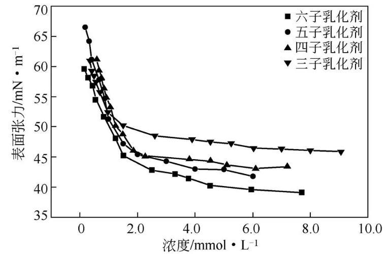 將桐油三酸酐和桐油三酸酐與甲基丙烯酸β羥乙酯反應(yīng)后的產(chǎn)物TM3H1及TM3H2水解,形成羧基官能團(tuán)數(shù)為4~6的丙烯酸酯改性的桐油基衍生物,TM3H3含有3個(gè)羧基。將羧酸改性的桐油用堿等當(dāng)量中和,形成含3~6個(gè)羧酸鈉基團(tuán)的桐油基衍生物,簡稱為3~6子乳化劑。桐油及乳化劑的表面張力測試結(jié)果如圖5所示,與純水(實(shí)測表面張力69mN/m)相比,4種多子乳化劑均能降低水的表面張力。表面張力隨其濃度的增加而下降,當(dāng)乳化劑濃度大于2.5mmol時(shí),溶液的表面張力隨濃度的變化趨于平穩(wěn),逐漸接近水平。乳化劑濃度為1.5mmol/L時(shí),3~6子乳化劑表面張力分別為50.2mN/m、48.8mN/m、47.2mN/m和45.2mN/m。