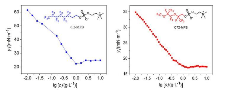 我們進一步探究了C72-MPB與化合物6:2-MPB表面性能的差異,使用Gibbs方程對rcmc的值進行計算,由rcmc進一步計算在cmc處每個分子在空氣~水界面的表面活性劑所占面積,即Amin: